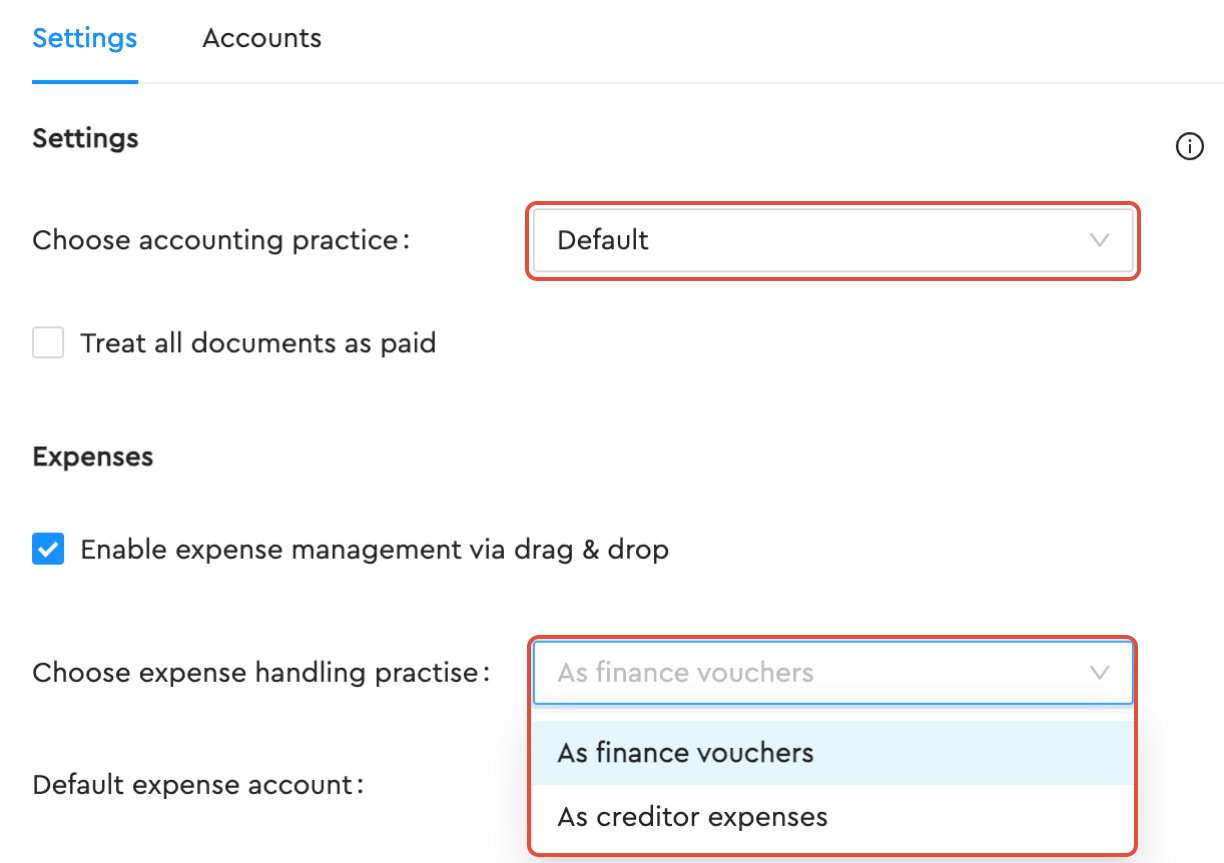 - If you choose standard for accounting practices, you have the option to choose between financial vouchers and creditor expenses. This only applies to personal expenses. through the mobile app or if you (enable expense management via drag and drop) , so if you send receipts through email or drag and drop, they will follow "default" accounting practice.