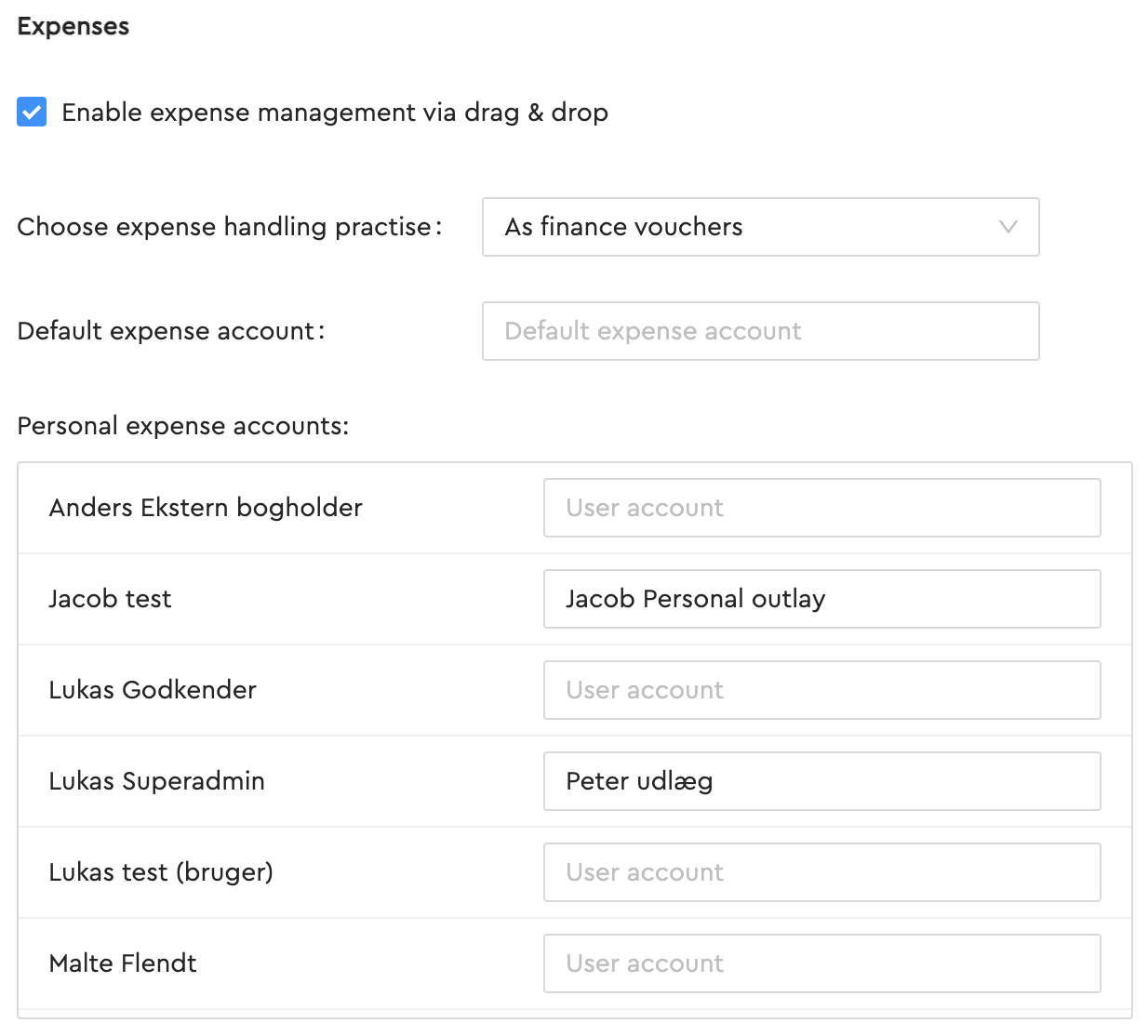 - Finance vouchers: When choosing "As finance vouchers" for expenses, you have the option at the user level to choose an account that the expenses will be posted to. Or set-up a default expense account, that will be picked, if they dont have a personal user account. Read this article to see how it is done: