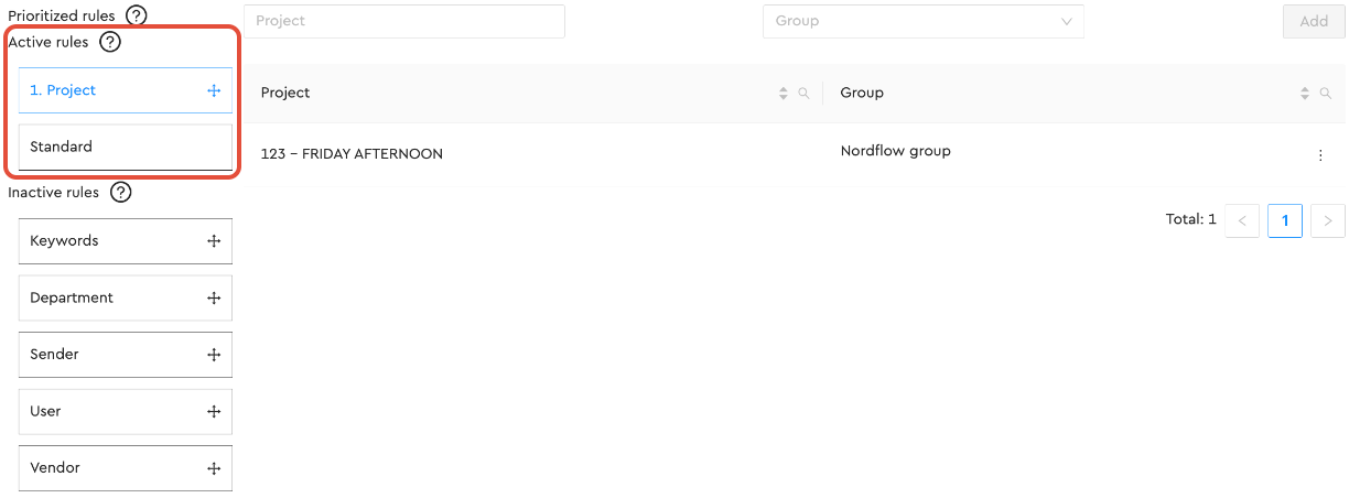 In this example, I have selected 'Friday Afternoon' as the project and 'Nordflow group' as the first approver group if 'Friday Afternoon' is selected as the project on the document. If 'Friday Afternoon' is not selected as the project on the document inside the approval flow, then the standard rules will be applied.