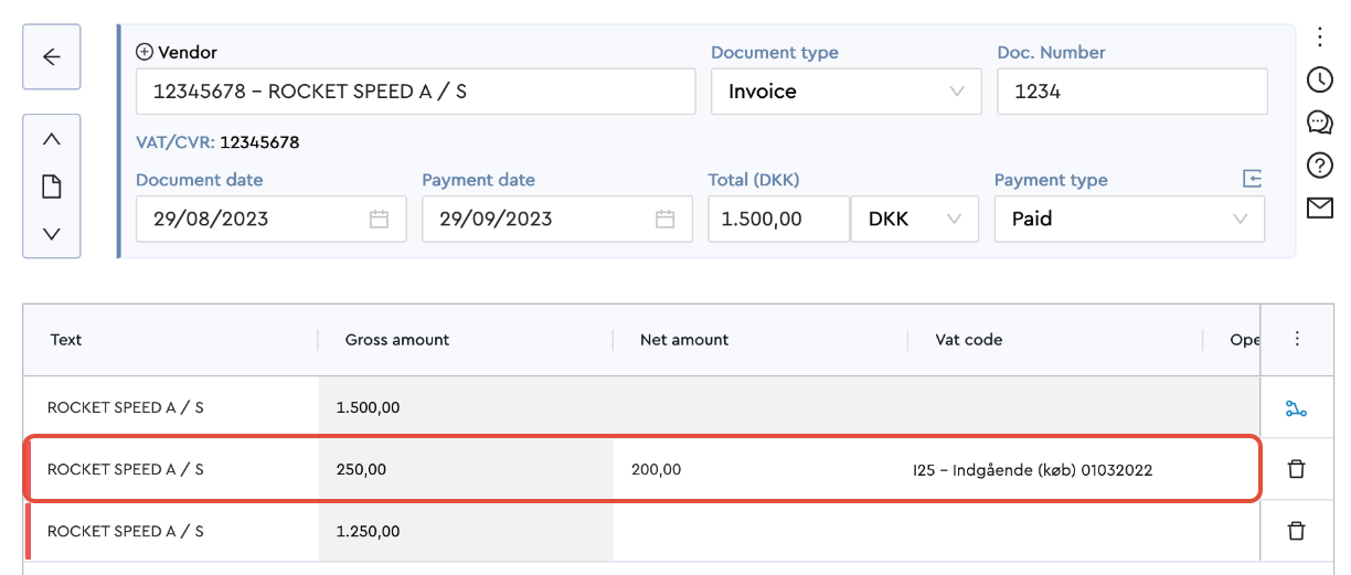 In this example, the net amount is 200, with a 25% VAT code, resulting in a gross amount of 250.